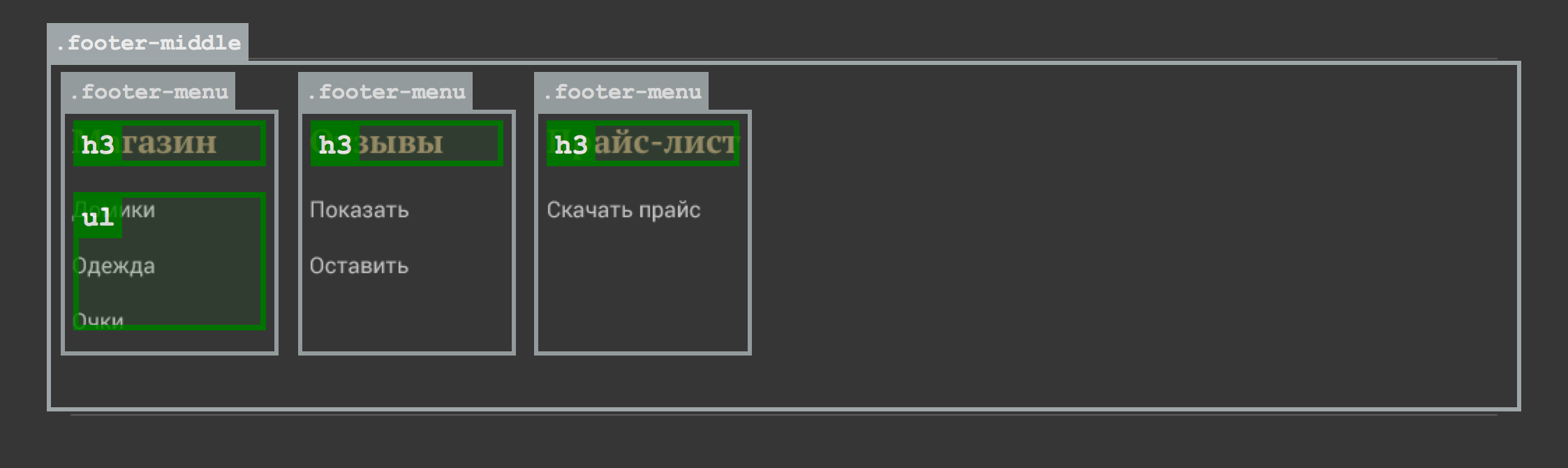 Каждая колонка .footer-menu — это отдельный раздел навигации со своим заголовком и списком ссылок.