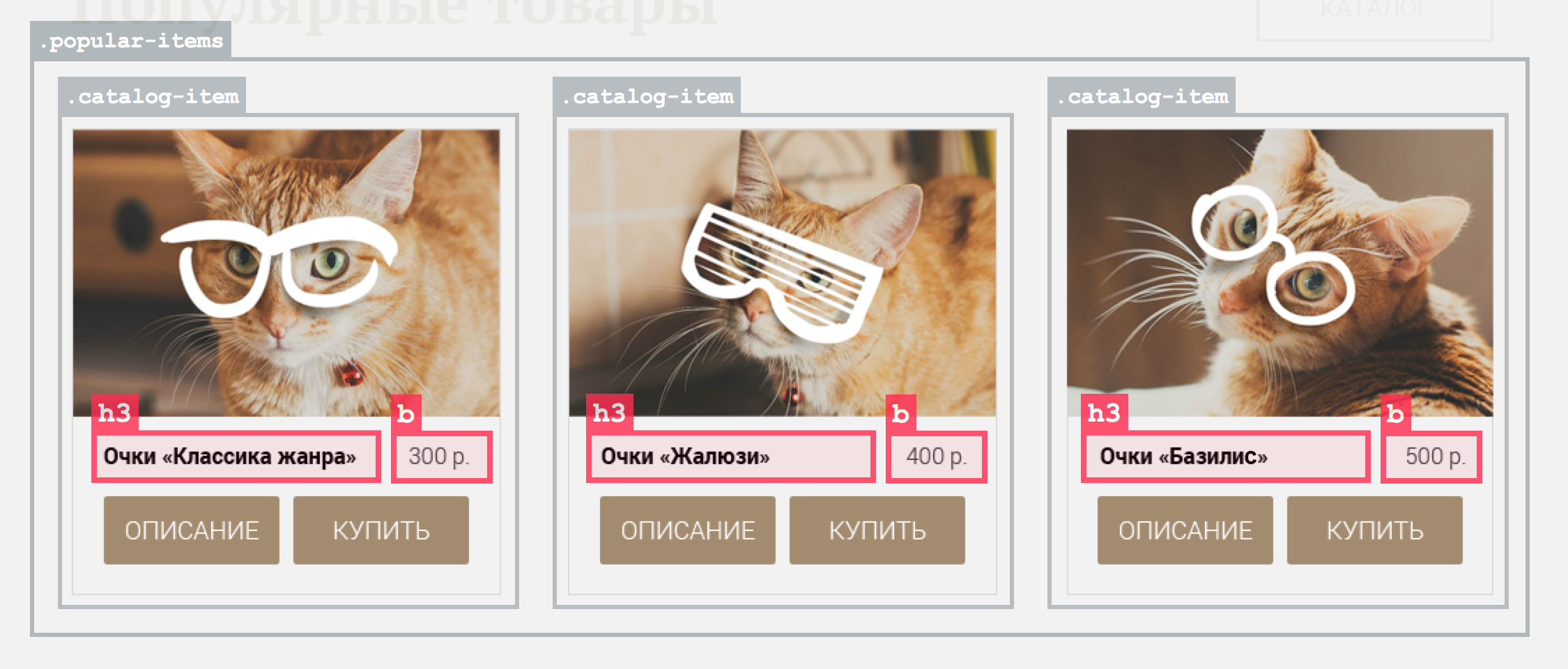 Немного дополним разметку популярных товаров: название товара сделаем заголовком третьего уровня, а цену просто выделим, без придания особой важности, то есть используем тег b.