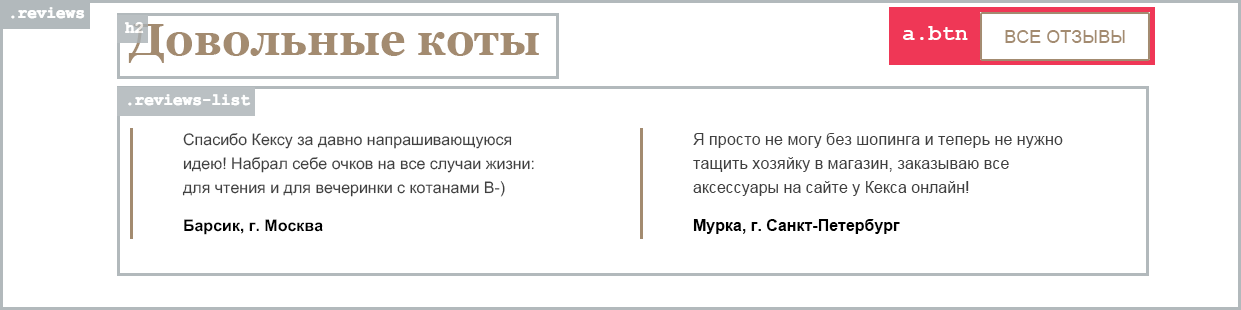 В разделе отзывов осталось добавить в разметку одну ссылку, которая на макете выглядит как кнопка. Всё так же, как в разделе «Немного теории».