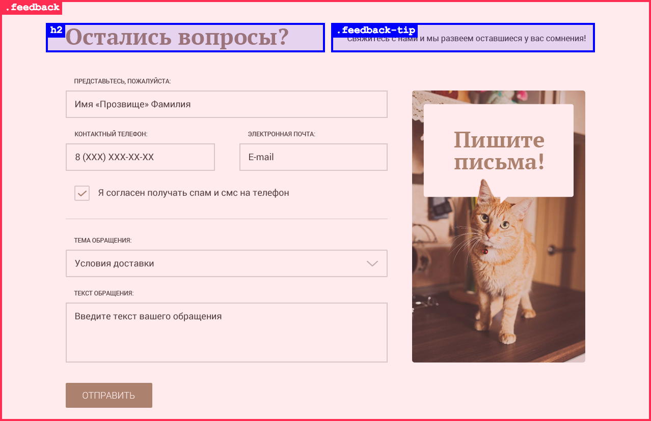 Раздел формы обратной связи разметим дивом с классом feedback, добавим внутрь него заголовок второго уровня и поясняющий текст. Поясняющий текст — это полноценное предложение, поэтому для его разметки можно использовать тег p с классом feedback-tip.