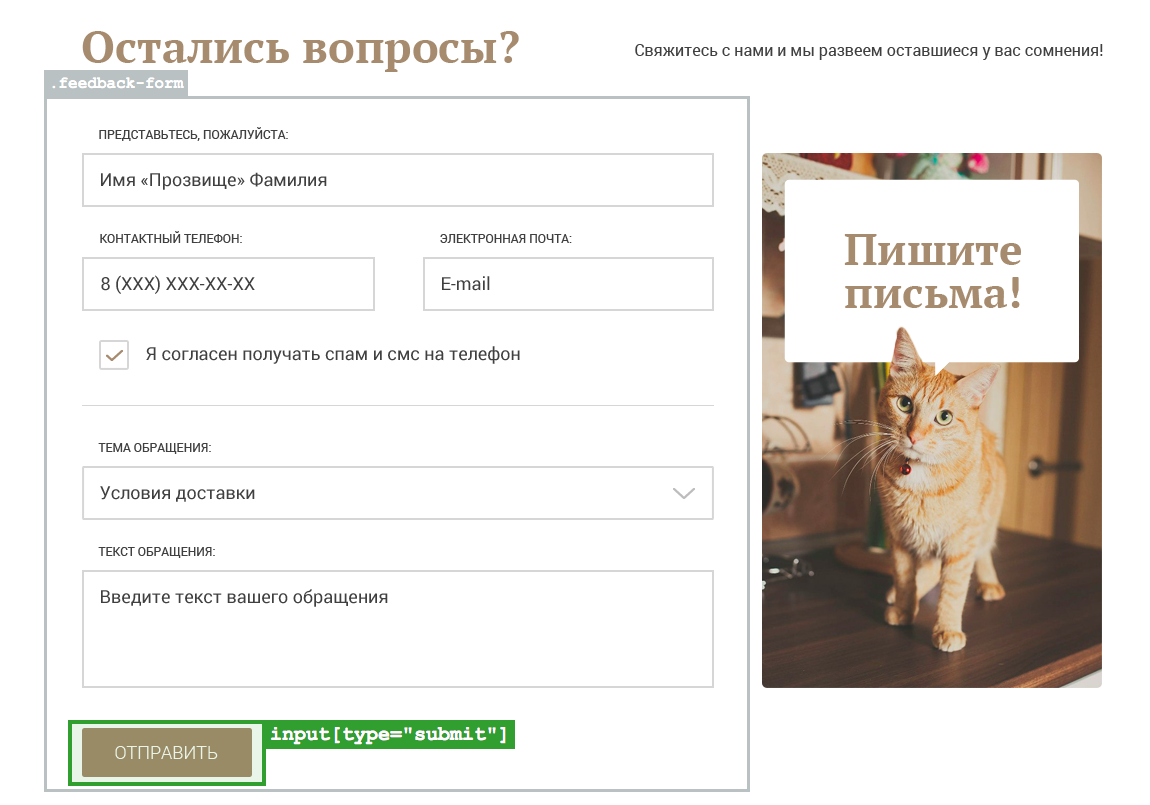 Остаётся добавить в форму кнопку отправки, и она будет готова! Зададим ей класс .btn для дальнейшего оформления.
