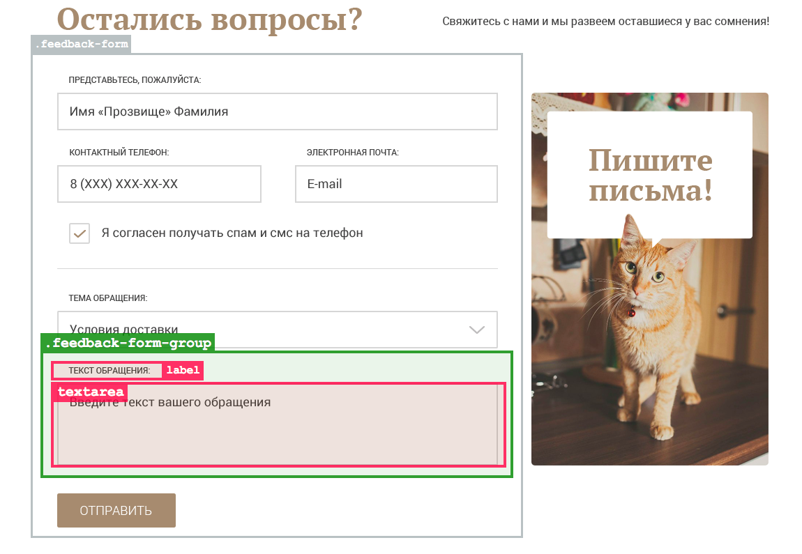 Последнее поле в форме будет содержать текст обращения пользователя. Сообщение может быть объёмным, поэтому давайте сделаем это поле ввода многострочным <textarea>.