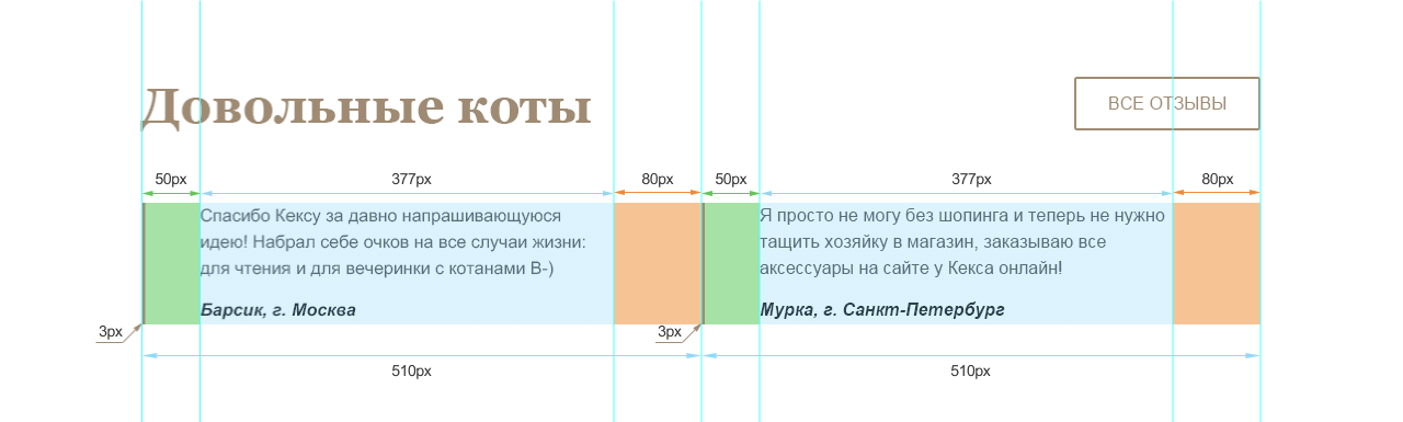 По макету общая ширина отзыва составляет 430px (мы измерили её на глаз так, чтобы текст помещался в контейнер), которая складывается из рамки слева в 3px, внутреннего отступа слева в 50px и ширины содержимого 377px. При таких размерах отступ между отзывами составляет 80px.